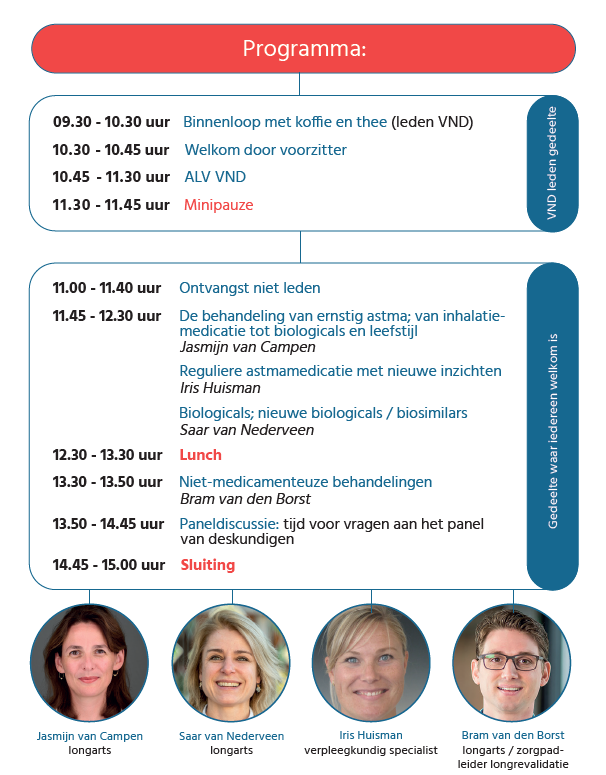 astmaVereniging Nederland en Davos (VND) is dé patiëntenvereniging voor alle mensen met (ernstig) astma. Na een succesvolle dag in 2025, nodigen we je weer van harte uit om als lid of als (nog) geen lid, deel te nemen aan deze inspirerende dag over (ernstig) astma. Het eerste gedeelte van de ochtend is de Algemene Ledenvergadering (ALV) en is alleen toegankelijk voor leden. Daarna zijn ook niet leden van harte uitgenodigd, om tegen betaling van een bijdrage voor de koffie en lunch, aan het programma deel te nemen. Bekijk hier de uitnodiging, met daarop ook alle praktische informatie over de dag.