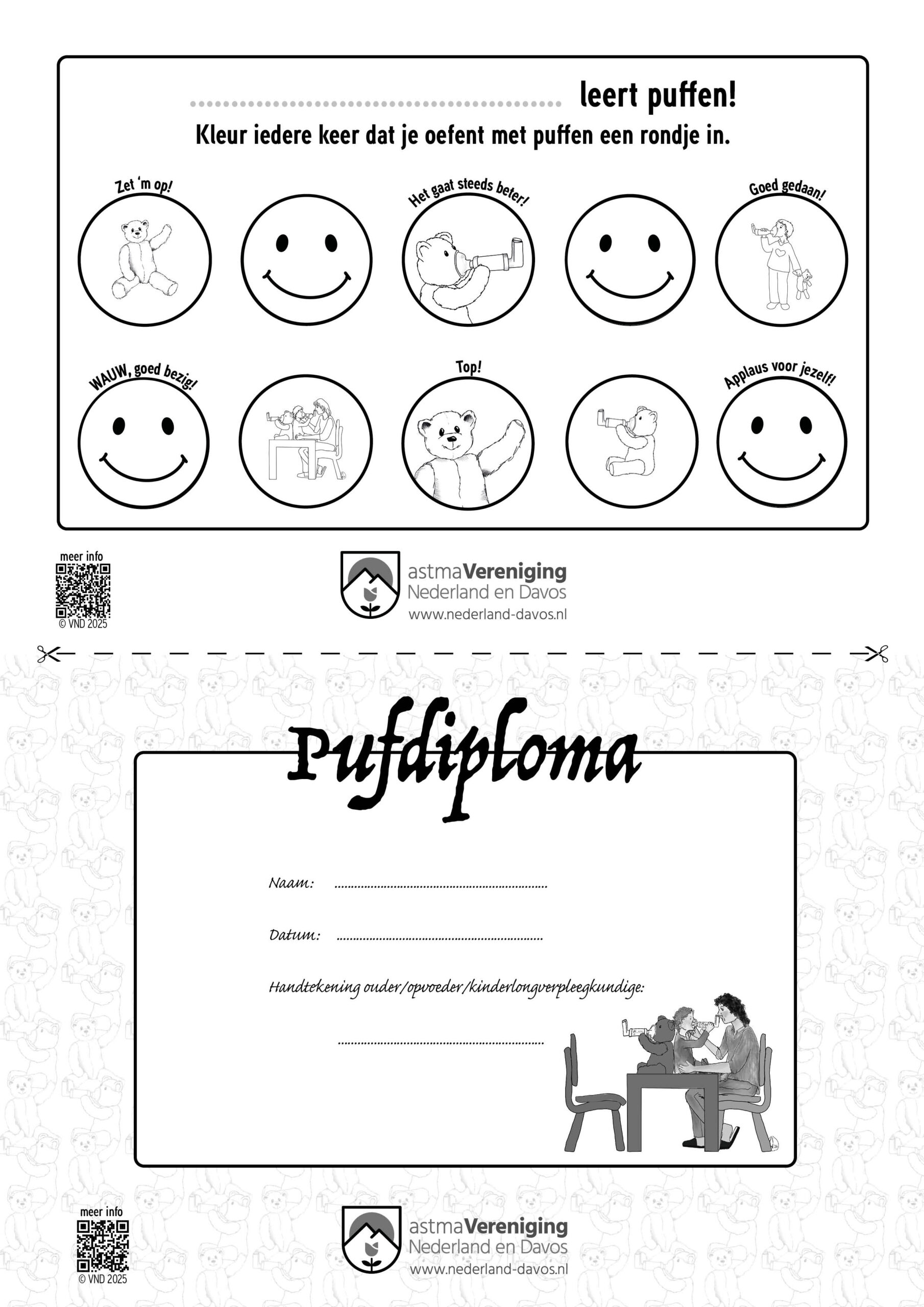 We vinden het belangrijk dat ieder kind zonder druk op zijn/haar eigen tempo leert puffen. Daarom hebben we een oefenkaart ontwikkeld die niet gaat om hoe goed het kind al kan puffen, maar enkel om het proberen. Iedere keer dat het kind oefent met puffen mag hij/zij een cirkel op de kaart inkleuren. Na tien cirkels is de kaart vol en heeft het kind zijn/haar pufdiploma verdiend!