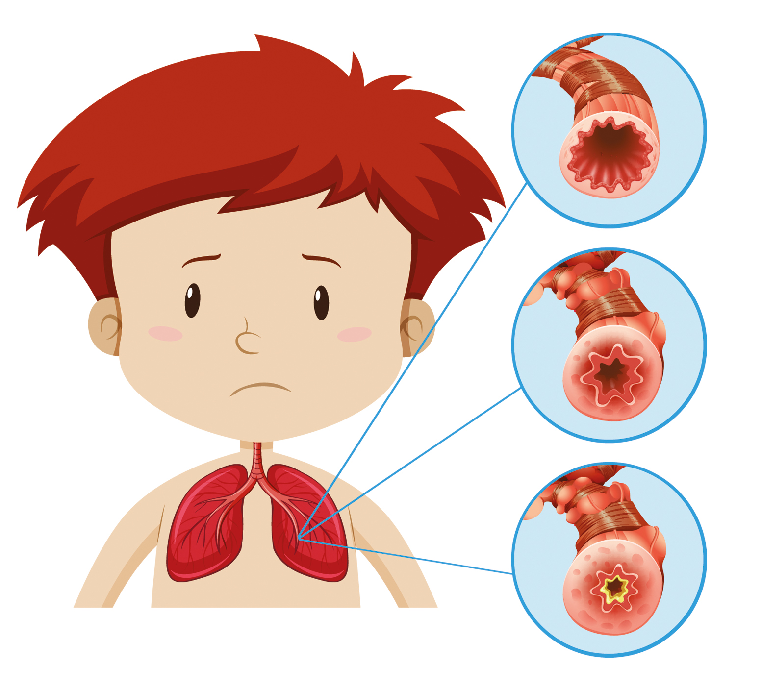 Als je ademhaalt gaat de lucht via je luchtpijp naar je longen. Je luchtpijp en longen bestaan uit vertakkingen die steeds kleiner en dunner worden. We noemen dit de bronchiën. Aan de uiteinden hiervan bevinden zich kleine blaasjes. Via die blaasjes wordt de zuurstof die je inademt opgenomen in je bloed en zo naar je organen gebracht. Aan de binnenkant van de bronchiën zit slijmvlies. Bij kinderen met astma is dit slijmvlies vaak ontstoken en zijn de bronchiën veel gevoeliger dan bij iemand die geen astma heeft. Dit houdt in dat het slijmvlies en de spierlaag om de bronchiën heen kunnen reageren op prikkels van buitenaf. De luchtweg vernauwt zich dan doordat de spierlaag zich abnormaal samen kan trekken, het slijmvlies kan gaan zwellen en/of er extra slijm aangemaakt kan worden. Hierdoor krijg je astmaklachten. Op de afbeelding hiernaast zie je een normale luchtweg en de versmalling van de luchtwegen door extra slijm en spiersamentrekkingen.